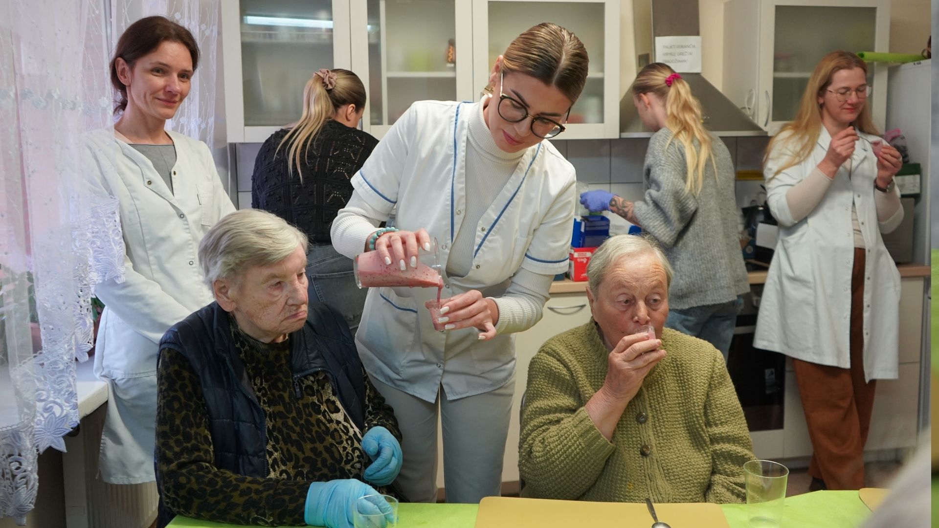 Viena iš slaugytojo užduočių yra rūpintis pacientų mityba, todėl būsimieji bendrosios praktikos slaugytojai turi išmanyti šią sritį. Vyresnio amžiaus žmonėms būdingi mitybos įpročių, suvokimo apie valgymo veiklą pakitimai: kai per daug ar per mažai valgoma, vartojama per mažai skysčių, trūksta kalio, folinės rūgšties, vitaminų D ir C ir kt. Seminaro metu studentės globos namų gyventojams pasakojo apie vaisių ir daržovių naudą, kokių medžiagų gaunama valgant konkrečius produktus. Studentės gamino glotnius vaisių/jogurto kokteilius, per klausimus seneliams pasakodamos apie kiekvieno kokteilio privalumus.