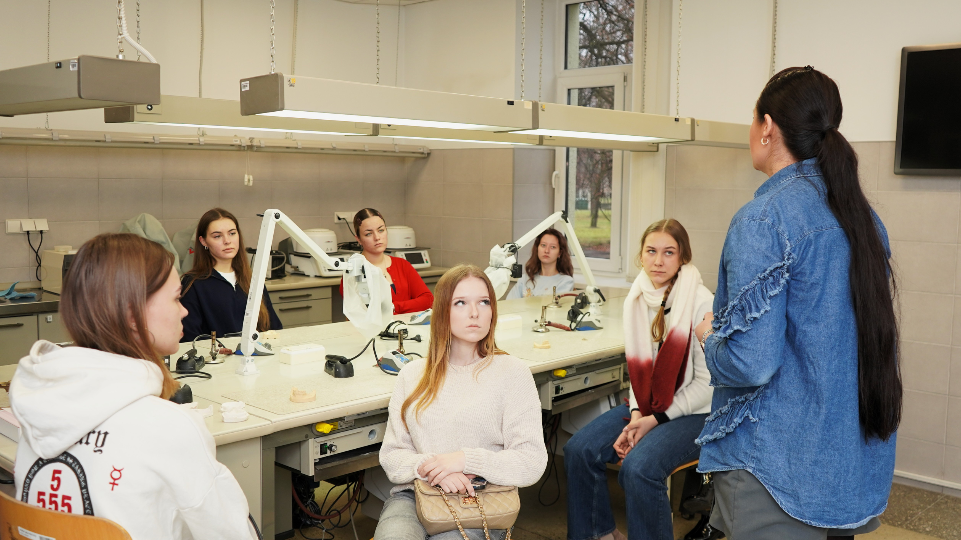 Dantų technologijų laboratorijoje dėstytoja Justina Vrubliauskaitė kartu su I kurso Dantų technologijų studijų programos studentais pristatė visus išimamojo protezo gamybos etapus. Moksleivės stebėjo išpolimerizuoto protezo valymą, apžiūrėjo laboratorijas ir įrangą, naudojamą studijų metu, ir sužinojo, kaip gaminami tiek išimami, tiek neišimami protezai.