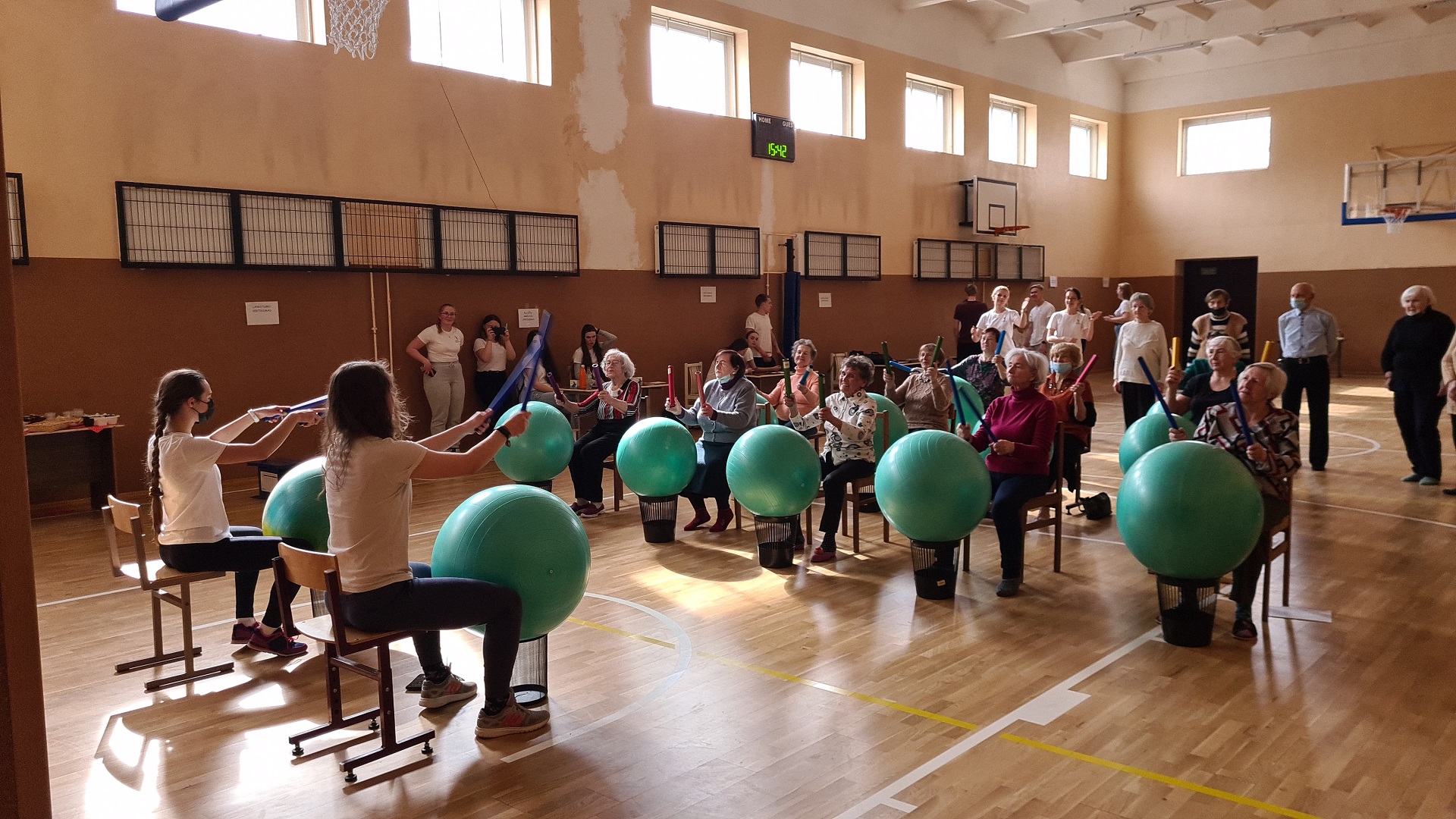 Susirinko nemažas būrys garbingo amžiaus bendrijos narių, kuriems studentai įvertino kojų ir rankų raumenų jėgą, lankstumą, pusiausvyrą, kvėpavimo funkciją, analizavo kūno kompoziciją, mokino savimasažo, pravedė mankštą sąnariams su kamuoliais. Linksmiausia dalis buvo kūrybinga sąnarių mankšta su didžiaisiais kamuoliais ir lazdelėmis pagal S. Povilaičio dainą „ Vėl, švieski man vėl“.