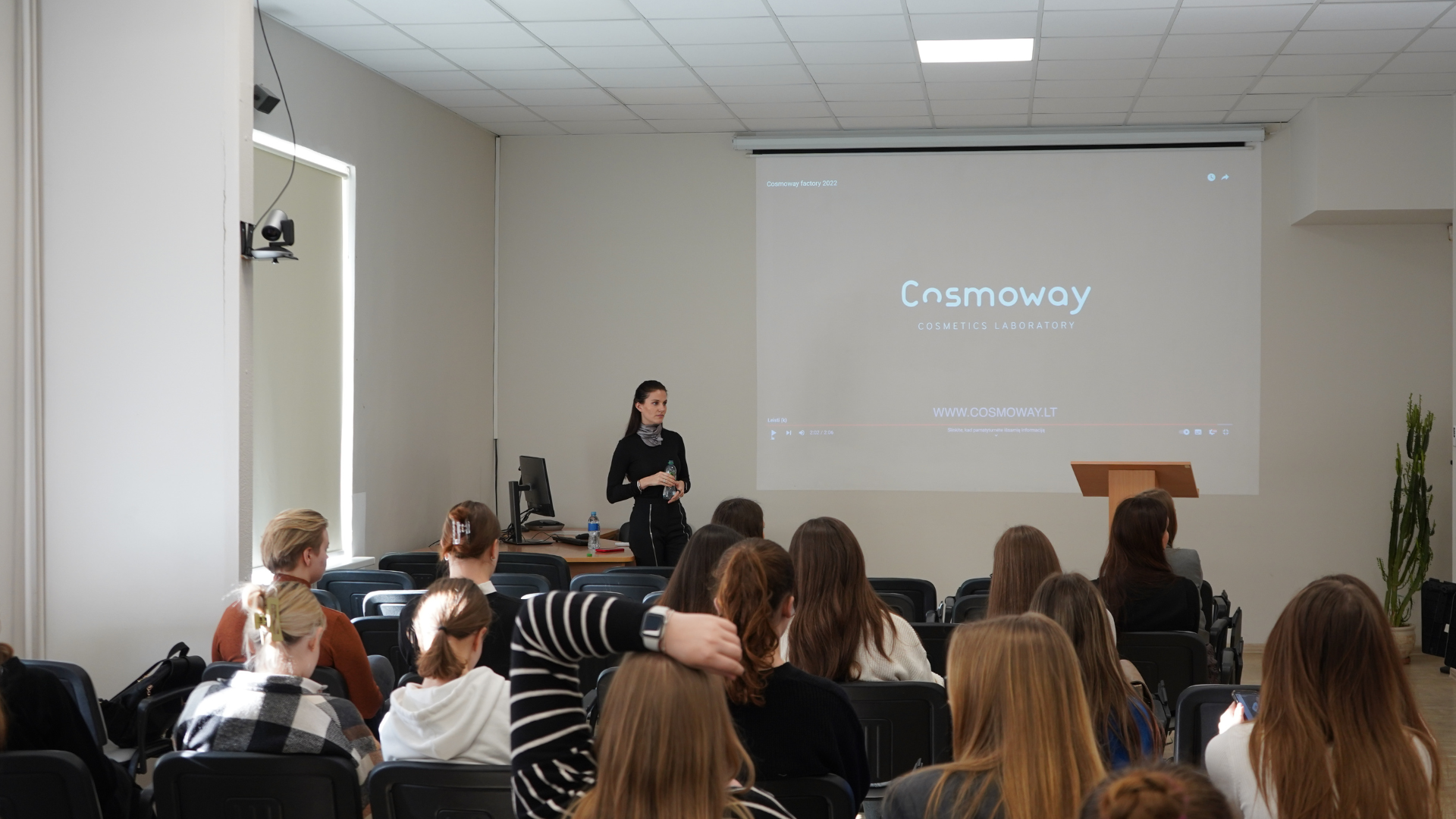 Po pristatymo studentės noriai uždavinėjo klausimus ir gilino savo žinias apie etinius klausimus kosmetikos gamybos procese, kosmetikos fabriko veikimo niuansus ir profesinę rolę kosmetikos naudojimo procesuose.