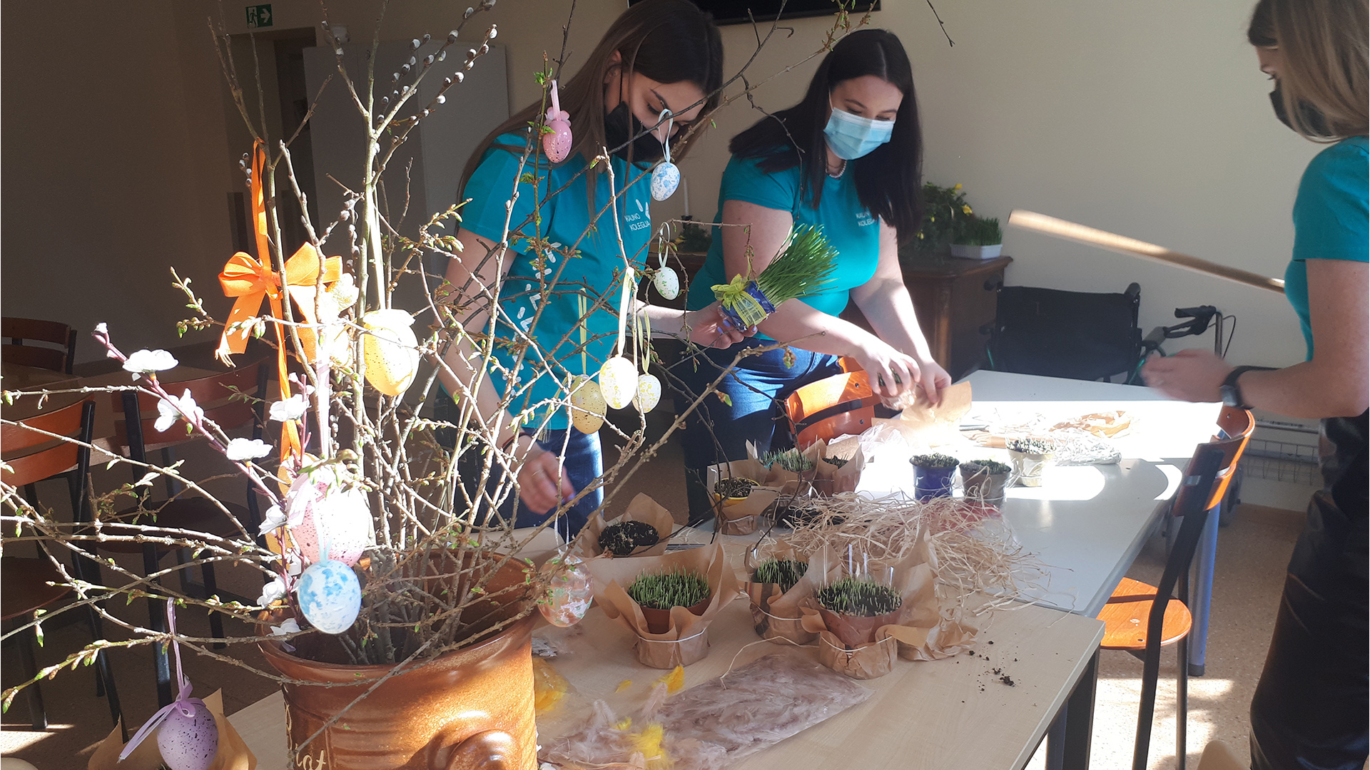 Medicinos fakulteto slaugos katedros lektorės: Rūta Lukianskytė, Loreta Bukartienė ir dr. Lina Urbietė kartu su bendrosios praktikos slaugos studentėmis: Judita, Vaineta, Dominyka ir Gerda paruošė želmenėlių bei gamino senoliams kadagio šakelių verbas, kurios buvo pasirinktos simbolizuojant gyvybę ir amžinybę. Verbas šventino Aukštosios Panemunės Švč. Mergelės Marijos vardo bažnyčios klebonas kunigas  – Rimantas Baltrušaitis.