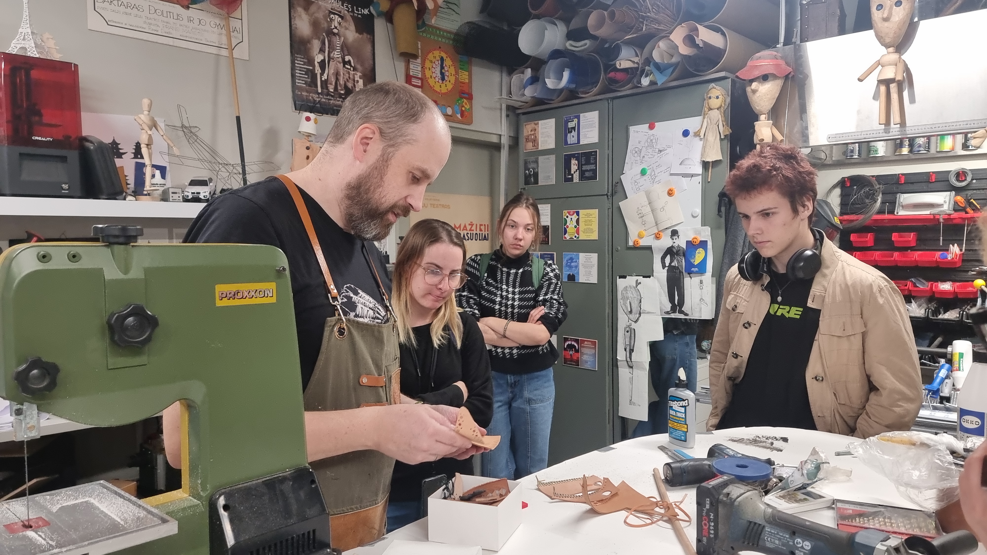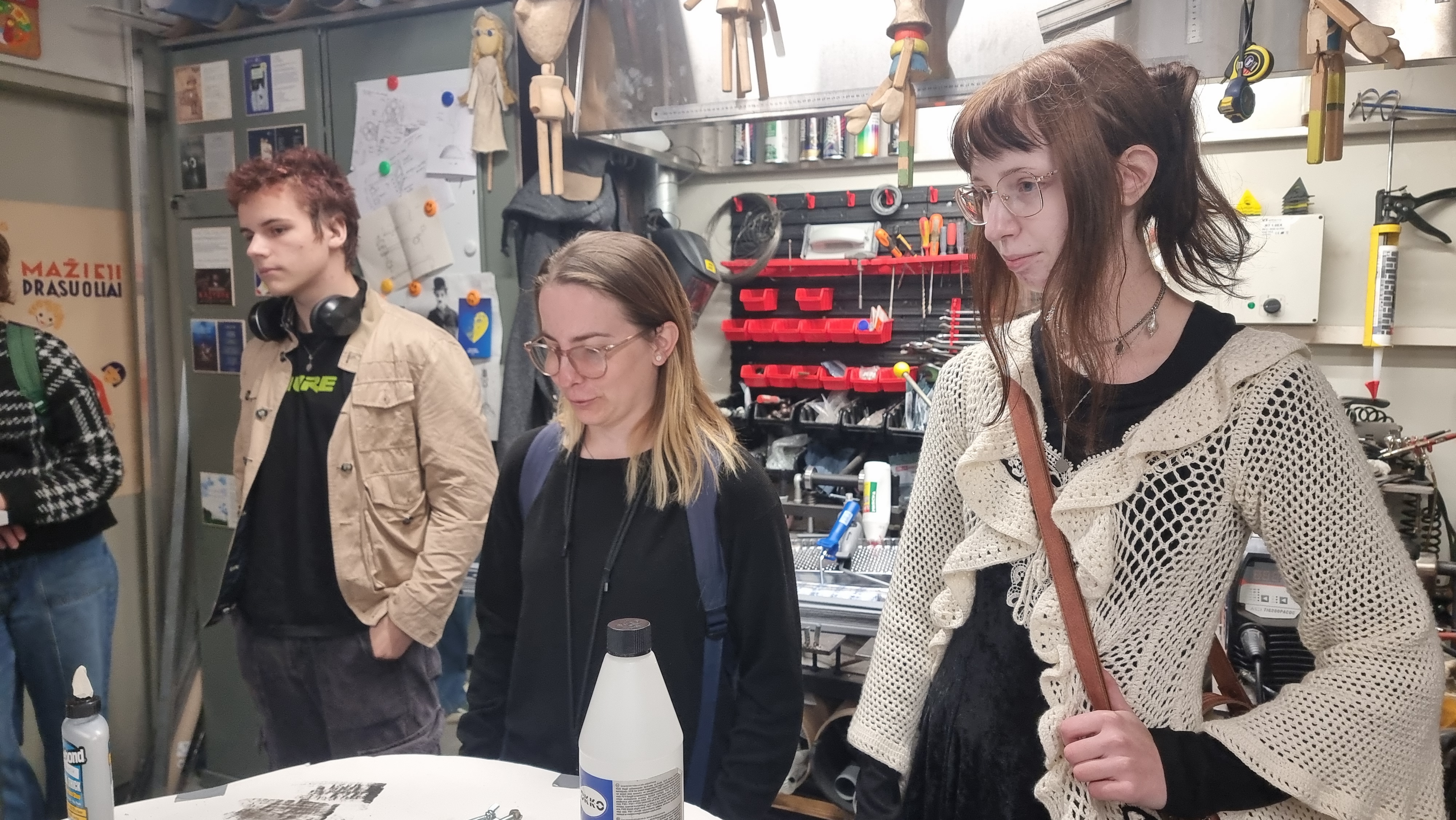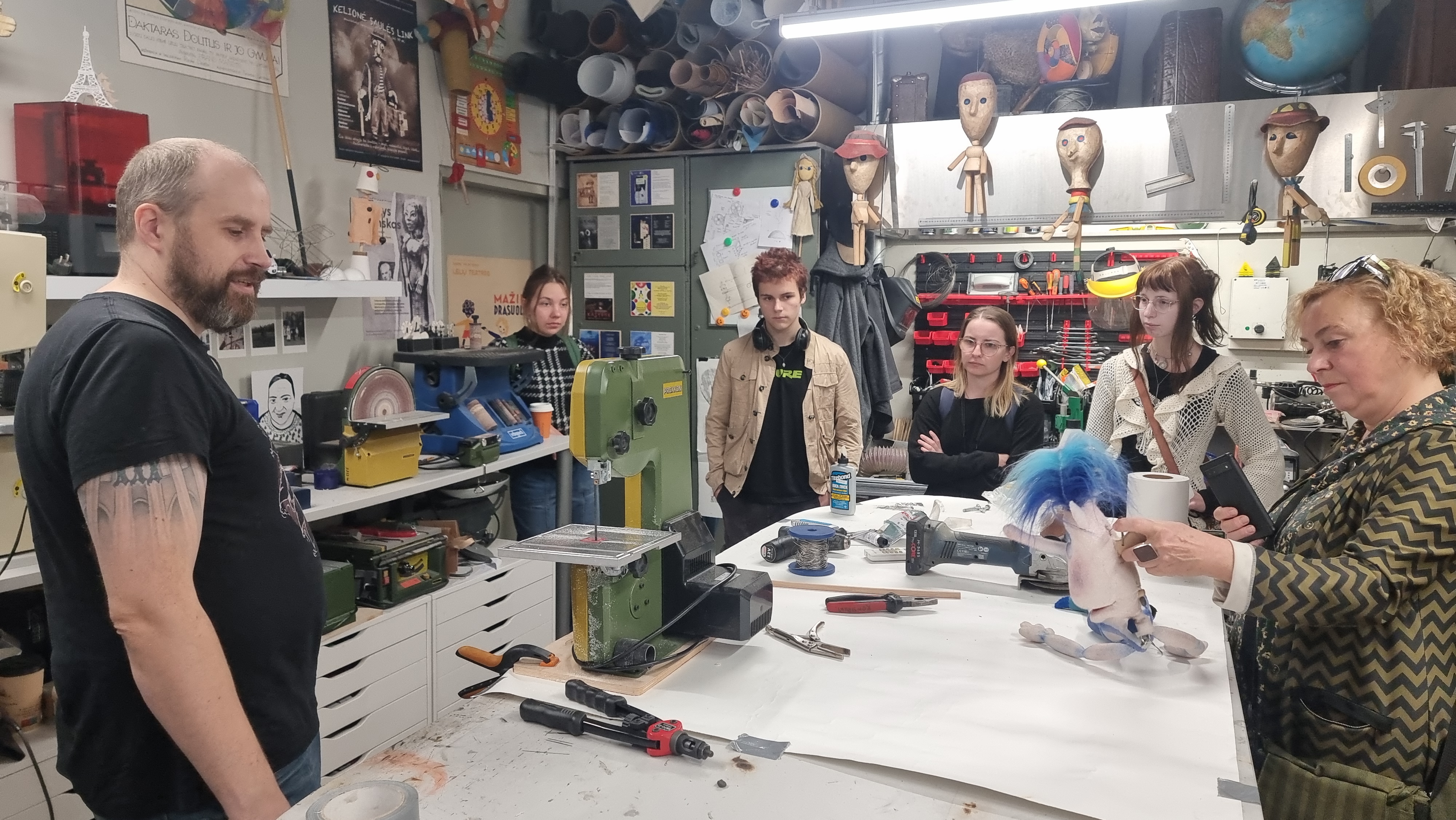 Tęsdami tradiciją spalio mėnesį aplankyti Menų akademijos absolventus jų kūrybinėse dirbtuvėse, Kauno kolegijos Menų ir ugdymo fakulteto Menų akademijos dėstytoja Lolita Grabauskienė kartu su Objektinio meno Odos specializacijos studentėmis Egle Anušauskaite, Ieva Parščenkovaite ir Samanta Vildyte apsilankė Kauno lėlių teatro kūrybinėje studijoje.