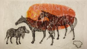 Kiekvienas menininkas parodai galėjo pateikti ne daugiau nei keturis savo darbus žirgo (arklio) tematikos motyvais, kurtus įvairiuose vaizduojamosios dailės žanruose. S. Grabliauskaitė parodai sukūrė diptiką „Prisilietimas prie praeities“, vaizduojantį pievoje besiganačius žirgus, gęstančios saulės fone. L. Grabauskienės kūrinyje „Lopšinė” – žirgas vaizduojamas dekoratyviai, tarsi pasakos personažas – stebuklinis ir paslaptingas.