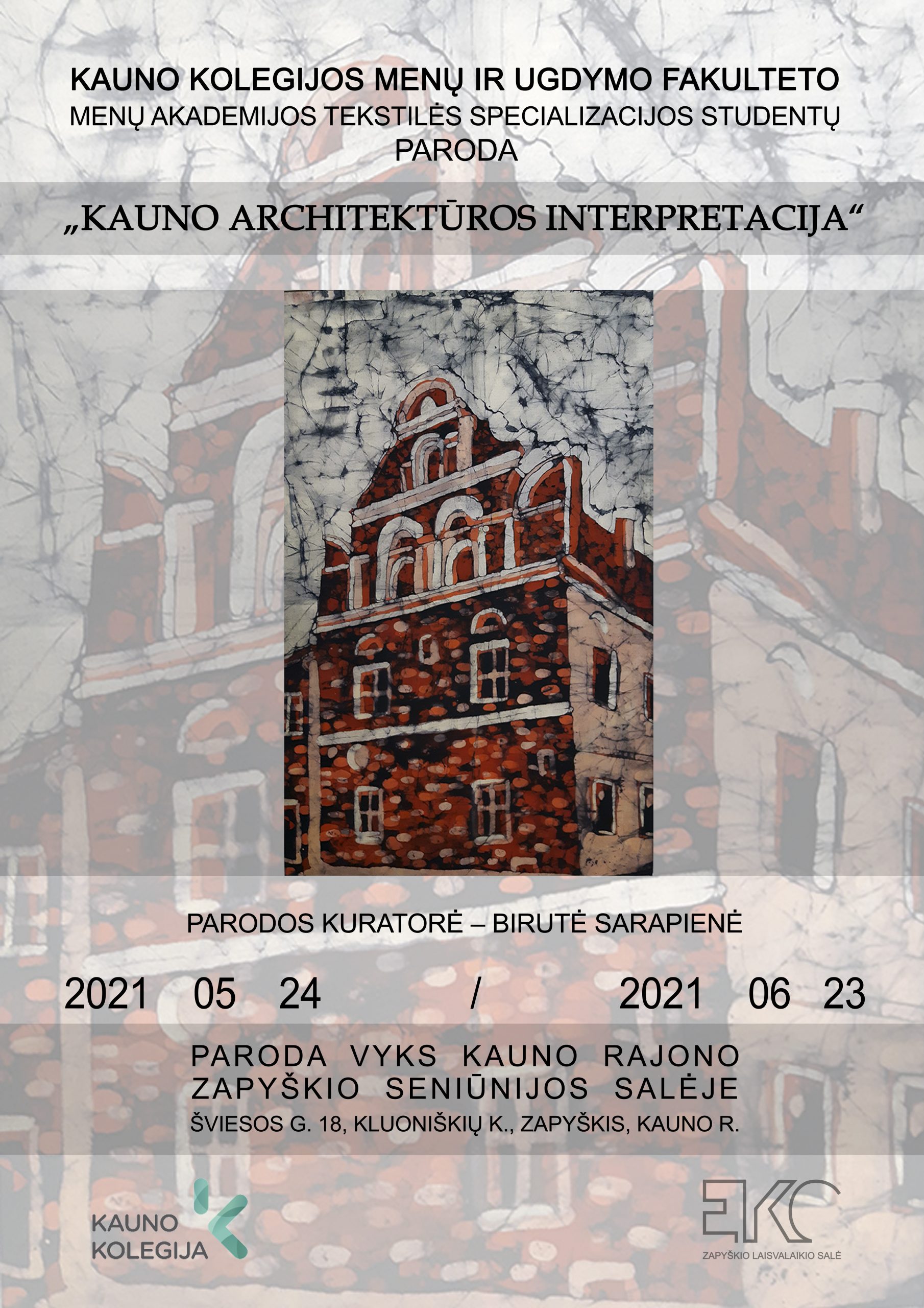Iki birželio 23 d. kviečiame apsilankyti Kauno rajono Zapyškio seniunijos salėje (Šviesos g. 18, Kluoniškių k., Zapyškis, Kauno r.) eksponuojamoje Kauno kolegijos Menų ir ugdymo fakulteto Menų akademijos Stiklo, keramikos, odos, tekstilės meno studentų batikos kūrinių parodoje “Kauno architektūros interpretacija”.