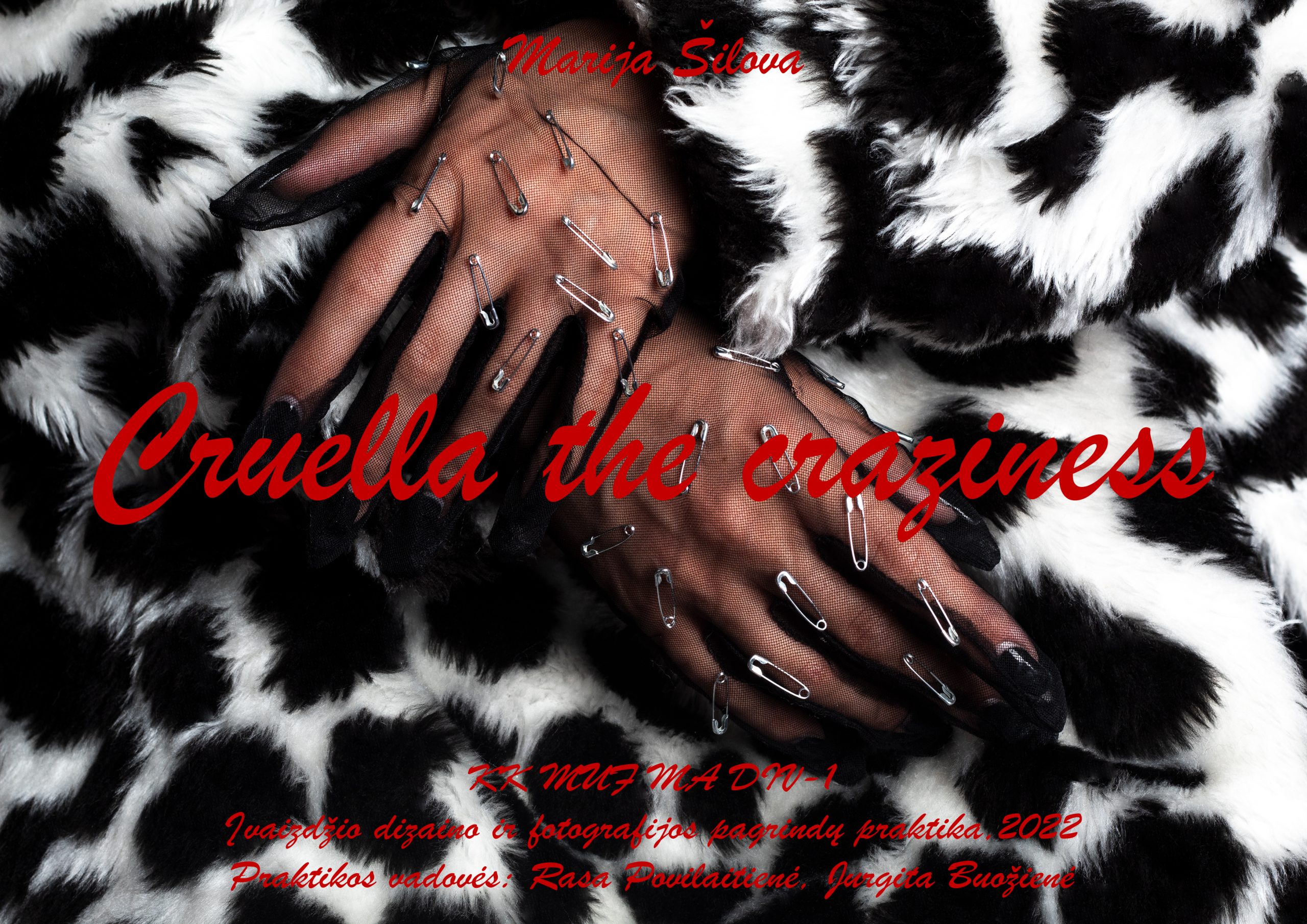 Tyrinėdami ir analizuodami šį personažą, studentai kūrė naujus įvaizdžius, reflektuojančius netikėtą, įdomią, intriguojančią Kruelos De Vil gyvenimo istoriją. Sukurtus įvaizdžius antrakursiai užfiksavo fotosesijose su modeliais, kuriose meniškai įamžino naujojo ekscentriškos mados dizainerės įvaizdžio variacijas portretinės, figūrinėse fotografijose bei aksesuarų nuotraukose.