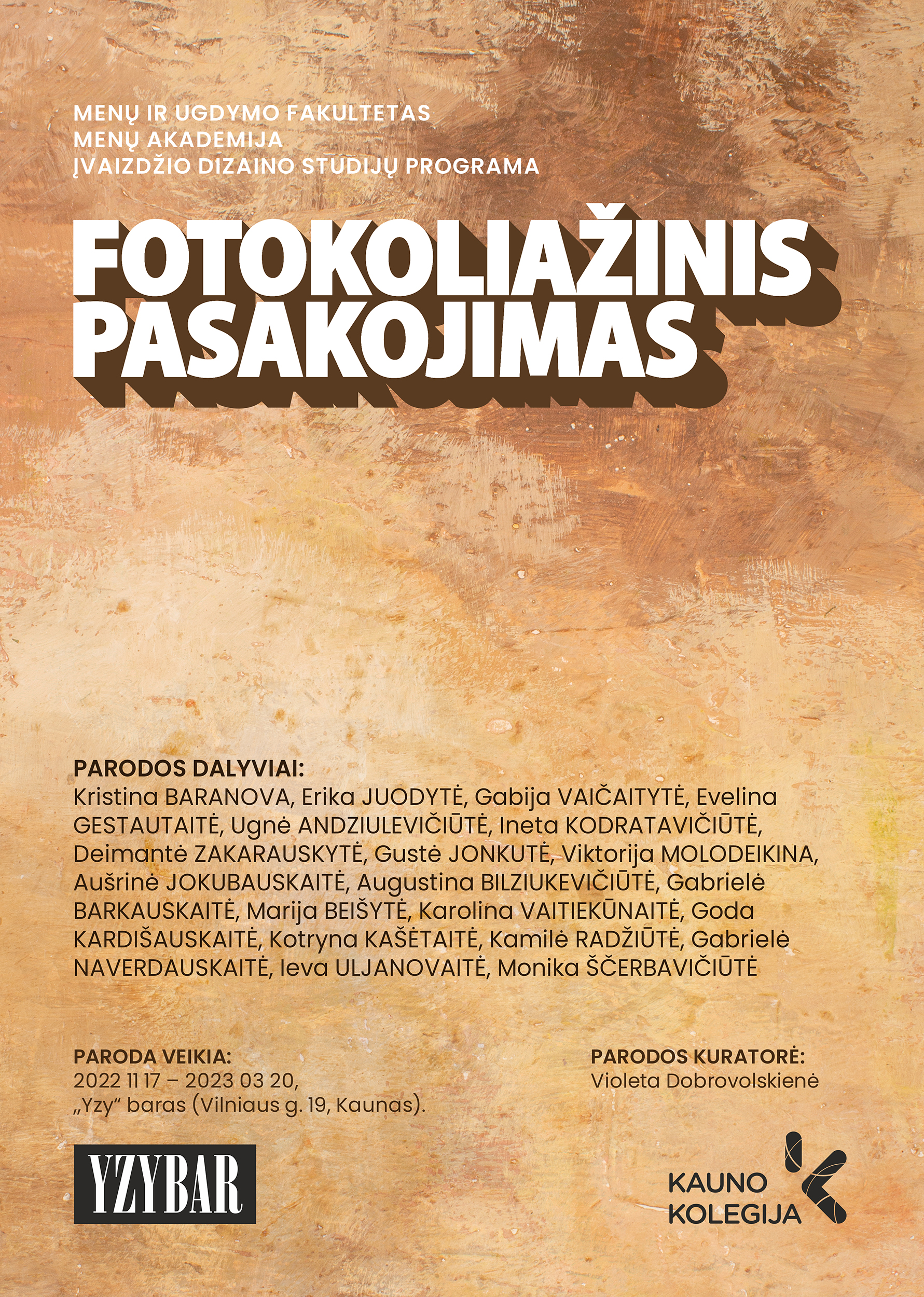 Lapkričio 17 d. (ketvirtadienį) 18 val. „Yzy“ bare (Vilniaus g. 19, Kaunas) atidaroma Kauno kolegijos Menų ir ugdymo fakulteto Menų akademijos Įvaizdžio dizaino studijų programos studentų ir absolventų fotografijos paroda „Fotokoliažinis pasakojimas“.