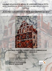 Iki gegužės 31 d. Kauno dailės gimnazijoje (Dainavos g. 1, Kaunas) eksponuojama Kauno kolegijos Menų ir ugdymo fakulteto Menų akademijos Stiklo, keramikos, odos, tekstilės meno studijų programos studentų batikos darbų paroda „Kauno architektūros interpretacija“.