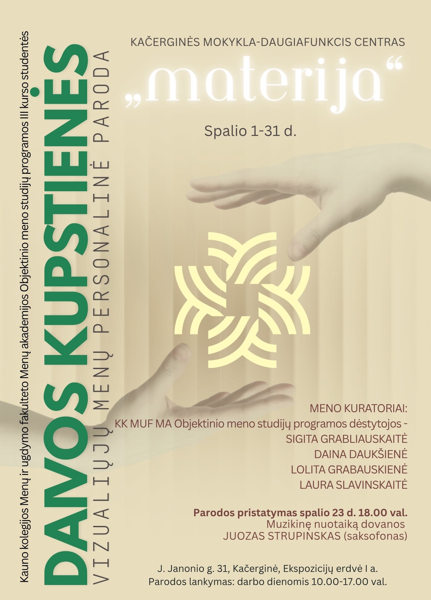 Kviečiame apsilankyti Kauno kolegijos Menų ir Ugdymo Fakulteto Menų Akademijos Objektinio meno studijų programos studentės Daivos Kupstienės vizualiųjų menų personalinėje parodoje „Materija“ spalio 1-31 d. Kačerginės mokykloje – daugiafunkciame centre ( J. Janonio g. 31, Kačerginė, Kauno r. sav.).