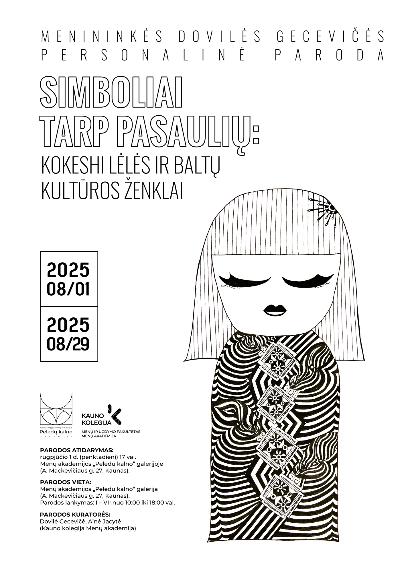 Labai atsiprašome, tačiau dėl objektyvių priežasčių, rugpjūčio 1 d. 17 val. planuotas menininkės Dovilės Gecevičės personalinės grafikos darbų parodos „Simboliai tarp pasaulių: kokeshi lėlės ir baltų kultūros ženklai“ atidarymas Kauno kolegijos Menų ir ugdymo fakulteto Menų akademijos „Pelėdų kalno“ galerijoje (A. Mackevičiaus g. 27, Kaunas) nukeliamas į rugpjūčio 8 d. (penktadienį), 17 val. Tačiau paroda galerijoje jau veikia, tad, jei atidarymo renginyje sudalyvauti negalėsite, kviečiame aplankyti ja jau nuo šiandienos. „Pelėdų kalno“ galerija atvira I – VII nuo 10:00 iki 18:00 val.