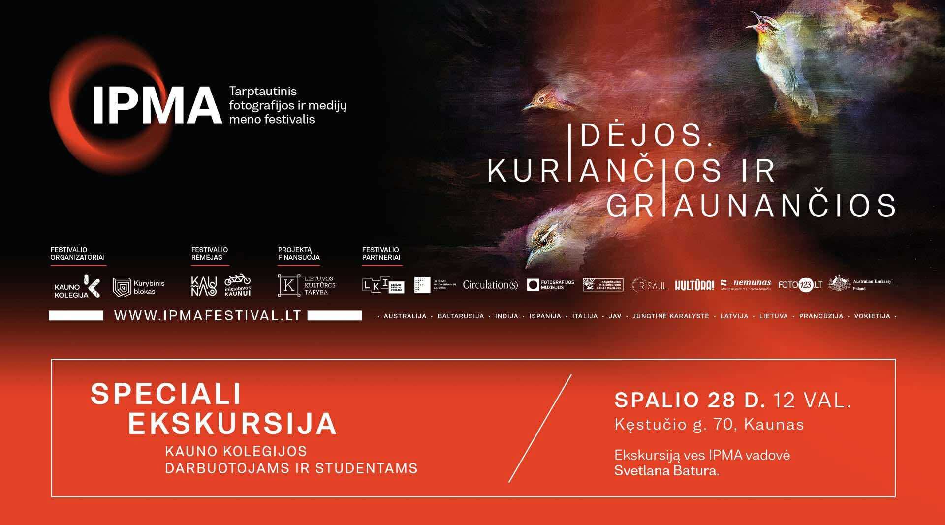 Kviečiame Kauno kolegijos bendruomenę į ekskursiją po tarptautinį fotografijos ir medijų meno festivalį IPMA, kurią ves festivalio vadovė, fotomenininkė, Kauno kolegijos Menų ir ugdymo fakulteto Menų akademijos lektorė Svetlana Batura.Šių metų festivalis kviečia apmąstyti idėjų įtaką mūsų kasdienybei, kultūrai, politikai, menui, tikėjimu. Kiekvienas festivalyje pristatomas projektas – savotiškas idėjos veidrodis, į kurį pažvelgus gali kilti klausimas: ar idėja veda į laisvę, ar, priešingai, sukausto?