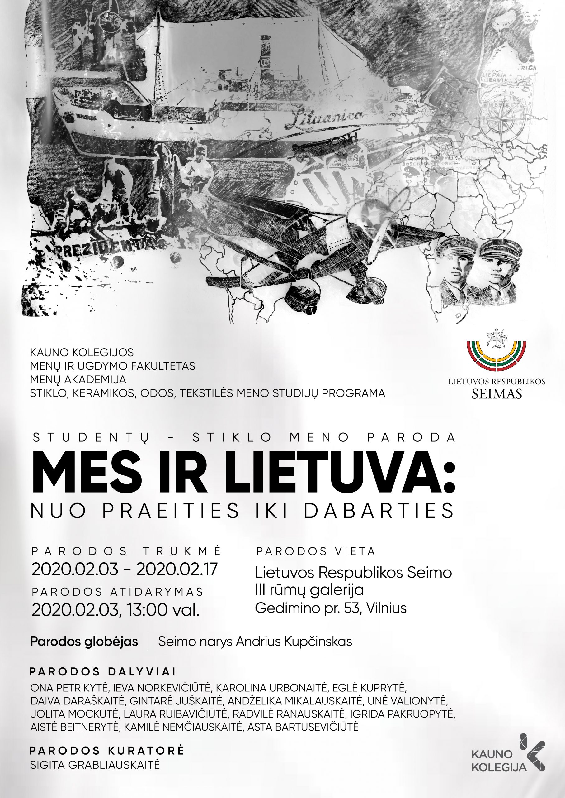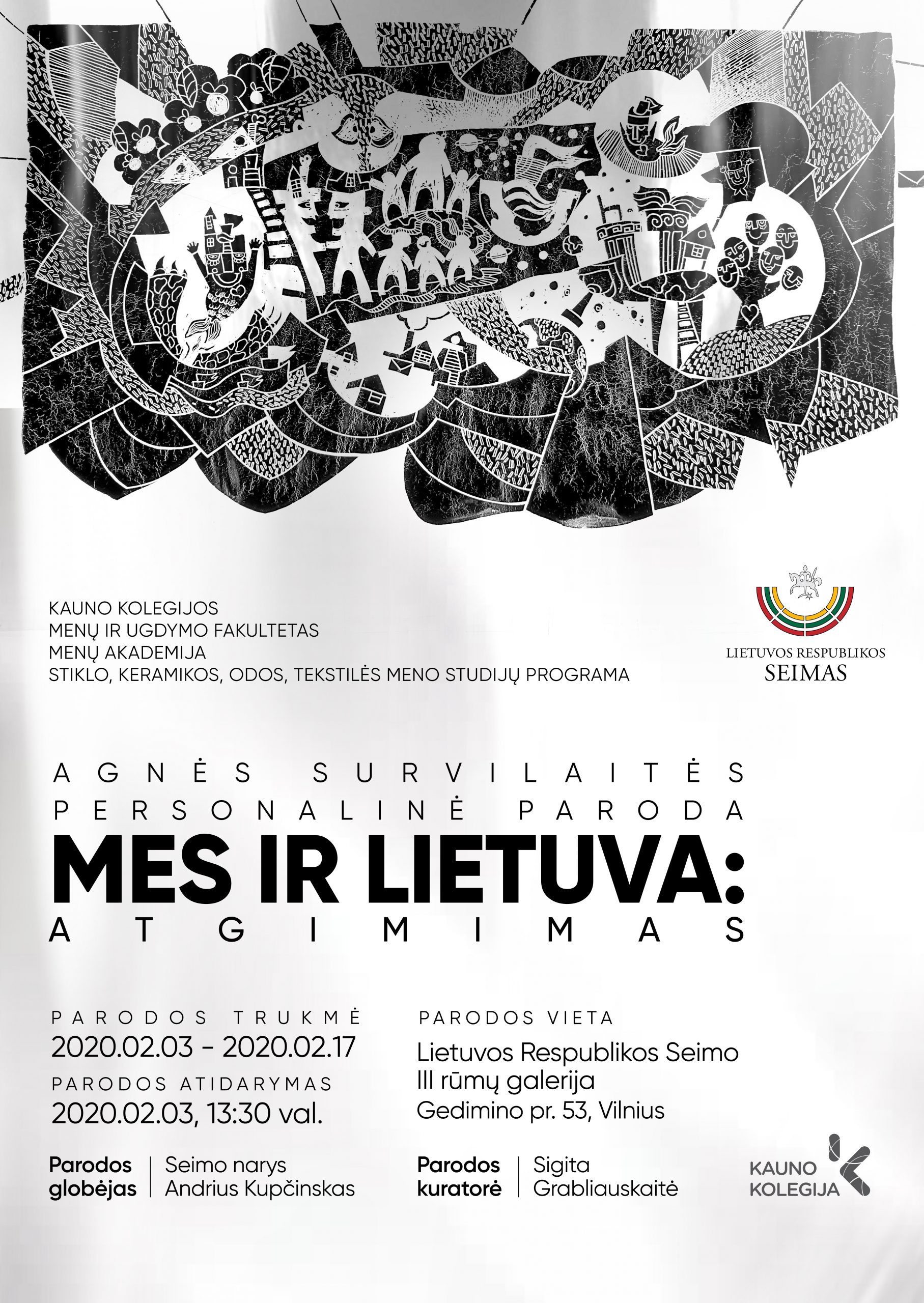 Lietuvos Respublikos Seimo III-ųjų rūmų galerijoje (Gedimino pr. 53, Vilnius) iki vasario 17 d. eksponuojamos dvi Kauno kolegijos Menų akademijos Stiklo, keramikos, odos, tekstilės meno studijų programos studentų parodos: grupinė stiklo meno kūrinių paroda „Mes ir Lietuva: nuo praeities iki dabarties“ ir personalinė programos absolventės Agnės Survilaitės paroda „Mes ir Lietuva: atgimimas“. Globojant Seimo nariui Andriui Kupčinskui, Menų akademijos studentų parodos Lietuvos Respublikos Seime yra surengtos pirmą kartą.