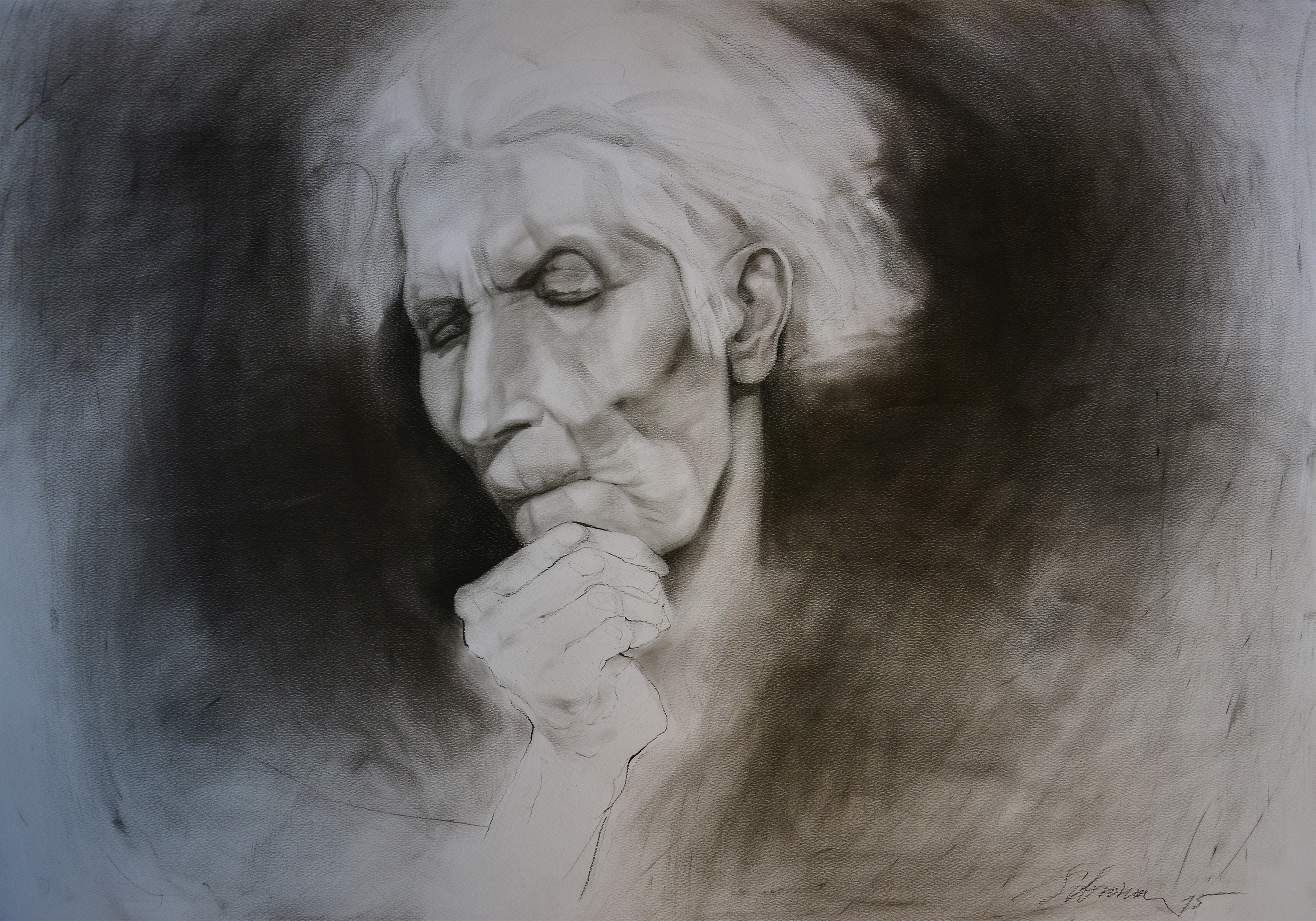 Džiaugiamės, kad tarp parodos autorių – ir Kauno kolegijos Menų akademijos dėstytoja Sigutė Bronickienė, pristatanti savo darbą šioje portreto žanrą aktualizuojančioje ekspozicijoje. Jos kūrinys „Mama. Tarp čia ir ten“ – jautri ir introspektyvi duoklė motinystei, artumo ir ilgesio būsenoms. Pasitelkdama anglies ekspresyvumą ir trapumą, dailininkė kuria subtilų motinos atvaizdą – tarsi regimą tarp realybės ir prisiminimo. Pavadinimas „Tarp čia ir ten“ leidžia interpretuoti kūrinį kaip refleksiją apie perėjimą, galbūt net ribą tarp gyvenimo ir anapusybės, fizinio buvimo ir dvasinio ryšio. Tai ne tik konkretus portretas, bet ir apibendrintas motinos simbolis – saugumo, šilumos, bet ir ilgesio ženklas. Minimalistinė, monochrominė raiška leidžia susitelkti į žvilgsnį, gestą, vidinę tylą, kuri sklinda iš paveikslo. Kūrinys kalba apie laikinumą, atmintį, ryšius, kurie tęsiasi už žodžių ir formų ribų.