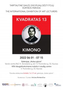 Birželio 1 d., trečiadienį, 17 val. „Aukso pjūvio“ galerijoje (BLC verslo centras, K. Donelaičio g. 62, Kaunas) atidaroma tarptautinio Baltijos šalių dailės disciplinų dėstytojų kūrybinio projekto „Kvadratas – 13: Kimono” paroda, kuruojama Kauno kolegijos Menų ir ugdymo fakulteto Menų akademijos dėstytojo, stiklo menininko Artūro Rimkevičiaus. Ekspozicijoje kūrinius pristato Menų akademijos Stiklo, keramikos, odos, tekstilės meno studijų programos koordinatorė, stiklo menininkė Sigita Grabliauskaitė, dėstytoja, odos menininkė Lolita Grabauskienė, dėstytoja, keramikė Birutė Šležienė, Dizaino studijų programos dėstytoja, grafikė Sigutė Bronickienė, Dailės kūrinių konservavimo ir restauravimo studijų programos dėstytojas, stiklo menininkas Artūras Rimkevičius ir Pedagogikos katedros docentė dr. Sigita Saulėnienė.