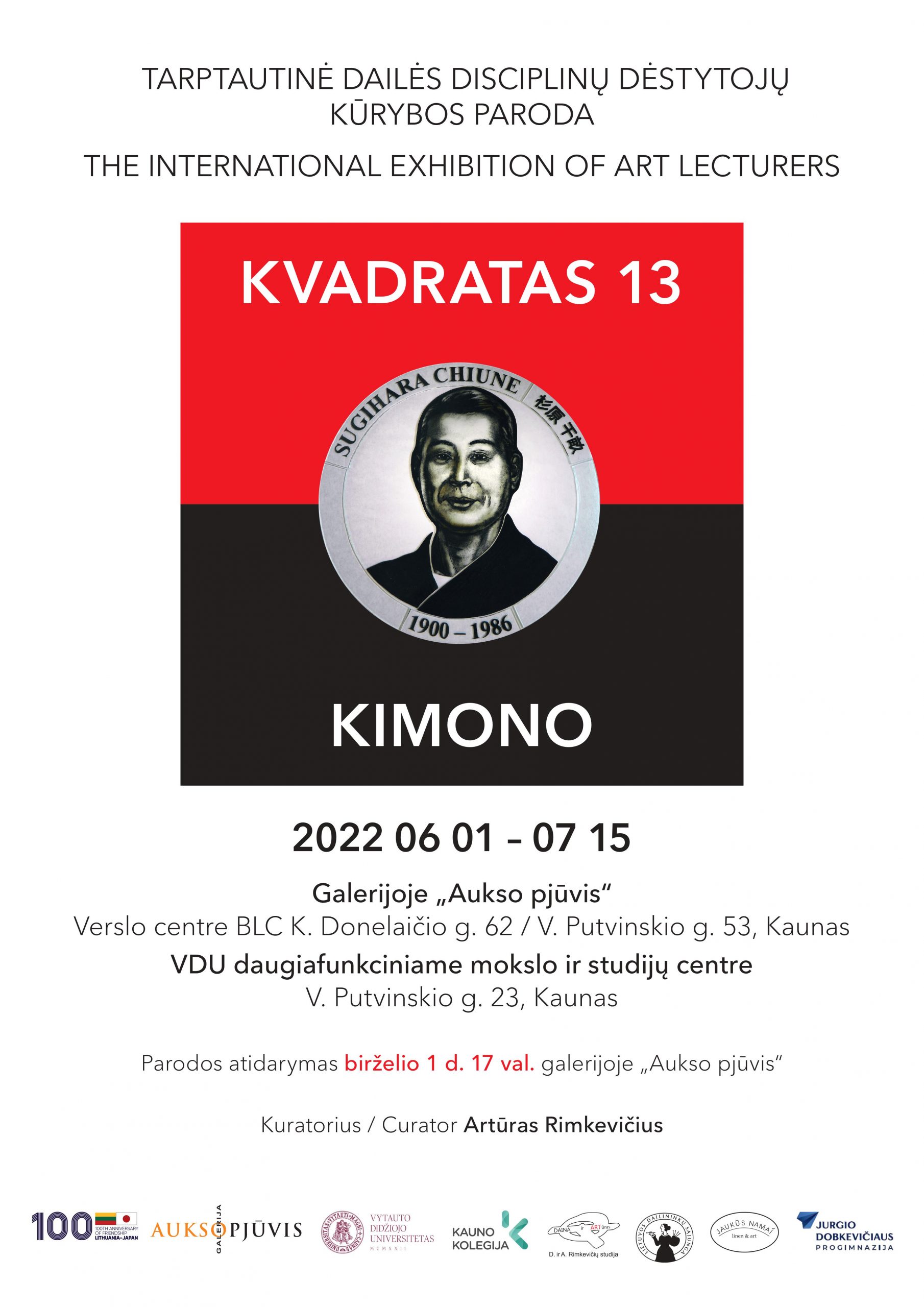 Japonija ir Baltijos šalys. Rytai ir Vakarai. Kimono ir baltų genčių rūbas. Ištisa jūra istorinių ir kultūrinių skirtumų. Tačiau greta – ir subtilios, gelminės japonų ir baltų pasaulėvokos jungtys. Jas dar kartą siekė apčiuopti projekto „Kvadratas-13: Kimono“ dalyviai – Lietuvos, Latvijos ir Estijos dailės disciplinų dėstytojai. Dar 2020 m. Chiunei Sugiharai (1900–1986) dedikuota paroda, jungianti japonų ir žydų kultūrinius arealus, dėl pandemijos apribojimų visuomenei buvo pristatyta virtualiu formatų, o žymint pirmąją vasaros dieną – projekto komanda džiaugiasi galėdama pakviesti žiūrovus į gyvą parodos atidarymą, rengiamą drauge su „Aukso pjūvio“ galerijos vadove, galeriste Lolita Vyžintiene.
