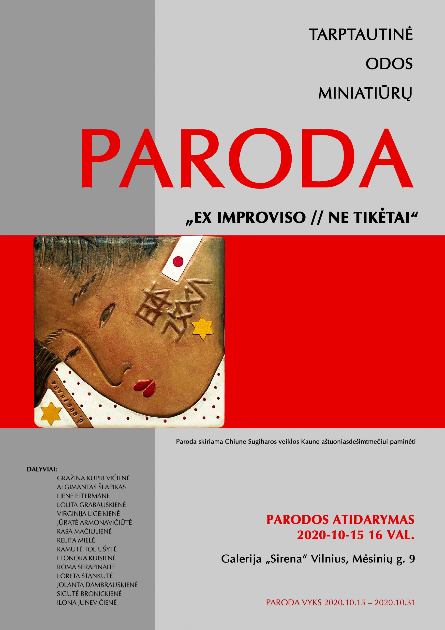 Tęsiantis japonų diplomato Čiunės Sugiharos atminimui skirtai savaitei, tęsiasi ir renginiai. Šiandien, spalio 15 d., 16 val. Menų ir amatų centre „Sirena“ (Mėsinių g. 9, Vilnius) atidaroma odos miniatiūrų paroda „Ex Improviso/(Ne)Tikėtai“, dedikuojama diplomato veiklos Kaune aštuoniasdešimtmečiui. Ekspozicijoje pristatomi Kauno kolegijos Menų akademijos Stiklo, keramikos, odos, tekstilės meno studijų programos dėstytojos, odos menininkės Lolitos Grabauskienės ir Dizaino studijų programos dėstytojos, grafikės Sigutės Bronickienės darbai.Šalia profesionalių odos menininkų kūrinių parodoje eksponuojami ir kitų vizualaus meno sričių kūrėjų darbai. Ekspozicijoje ne tik knygos, dėžutės, bet ir dekoratyviniai objektai, odos skulptūros, eksperimentiniai kūriniai. Darbus jungia ir pasirinkta medžiaga, ir žanras – miniatiūra, kuris dailininkams yra labai įdomus, nes kelia iššūkių – mažai formai taikliai parinkti technines ir menines priemones, siekiant jos įtaigumo.