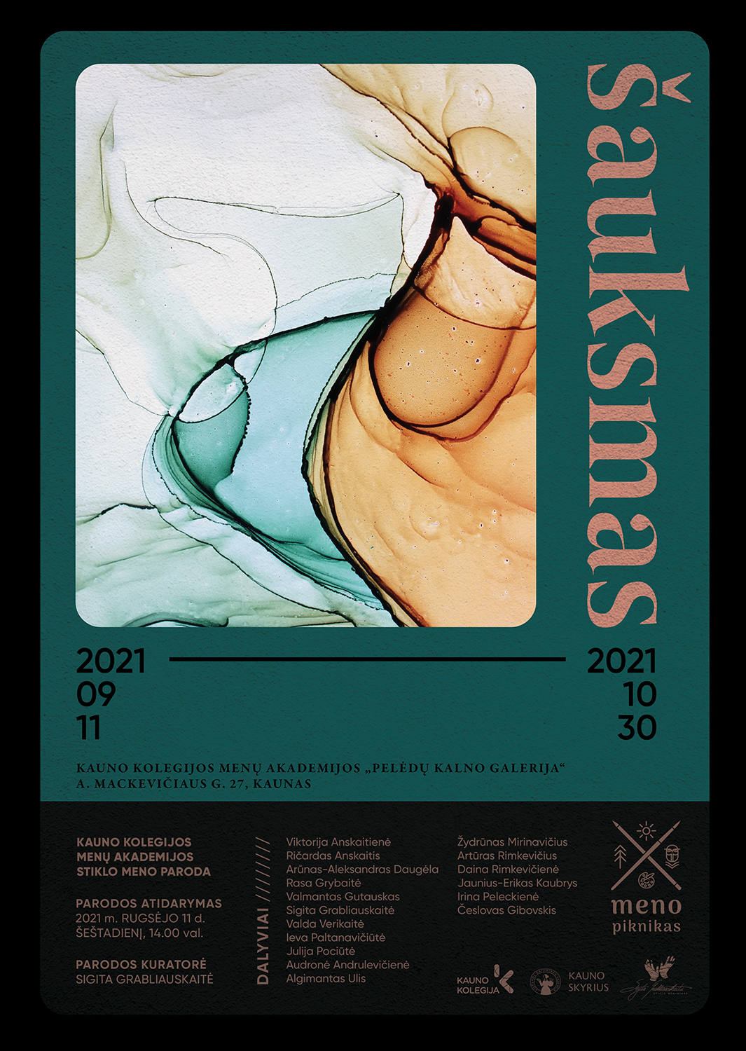 Nors “Meno piknikas” baigėsi, tačiau iki pat spalio 30 d. kviečiame apsilankyti renginį lydinčioje stiklo meno parodoje “Šauksmas”, eksponuojamoje Kauno kolegijos Menų ir ugdymo fakulteto Menų akademijos “Pelėdų kalno” galerijoje (A. Mackevičiaus g. 27, Kaunas). Stiklo, keramikos, odos, tekstilės meno studijų programos dėstytojos, stiklo menininkės Sigitos Grabliauskaitės kuruojamoje parodoje darbus pristato Menų akademijos dėstytojai ir absolventai, Vilniaus dailės akademijos Kauno fakulteto lektoriai, respublikinėse ir tarptautinėse parodose dalyvaujantys menininkai.