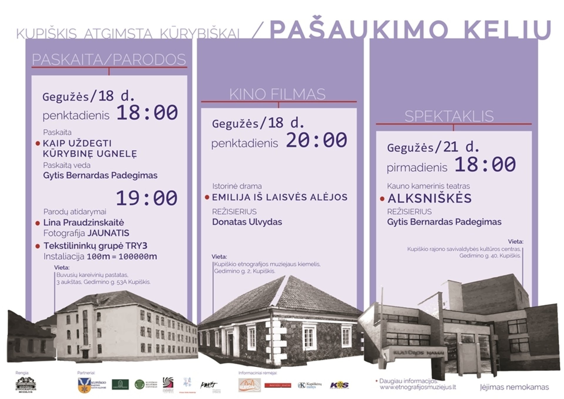 Gegužės 18, 21 dienomis Kupiškyje organizuojamas tarpsritinis renginys „Pašaukimo keliu“, vienijantis profesionalius bei pradedančiuosius atlikimo meno ir vizualaus meno kūrėjus. Renginys kviečia atsigręžti į save, kaip į savo gyvenimo kūrėją, priimantį sprendimus.