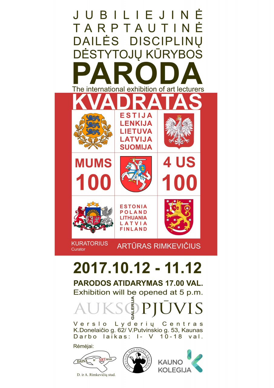 Spalio 12 dieną galerijoje „Aukso pjūvis“ (Verslo lyderių centras (BLC), K. Donelaičio g. 62, Kaunas) atidaryta tarptautinė teminė dailės disciplinų dėstytojų kūrybos paroda „Kvadratas 11“, kurią kasment organizuoja ir kuruoja stiklo menininkas, Kauno kolegijos Menų ir ugdymo fakulteto dėstytojas Artūras Rimkevičius. Šių metų paroda yra skirta Lietuvos, Latvijos, Estijos, Lenkijos ir Suomijos valstybių atkūrimo 100 – mečiui pažymėti.