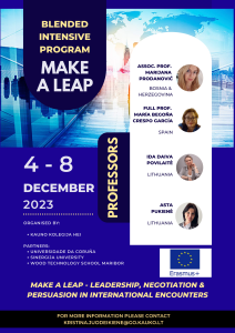 Renginio metu vyks ir intensyvi „Erasmus+ BIP“ programa „Make a LEAP“, kurios pagrindinės temos: lyderystė, derybų strategijos, įtikinėjimo menas, – skirta užsienio dėstytojams. Tyrinėdami lyderystę įvairiose srityse: versle, politikoje, pramogų sferoje programos dalyviai semsis naudingų ir praktiškai pritaikomų žinių, taip pat analizuos vadovavimo stilius ir modelius, gilinsis į derybų meną. Programoje įžvalgomis dalysis: Sinergijos universiteto (Bosnija ir Hercegovina) Filologijos fakulteto dekanė dr. Marijana Prodanović, Coruña universiteto (Ispanija) prof. Maria Begoña Crespo García, Menų ir ugdymo fakulteto lektorės Ida Daiva Povilaitė ir Asta Pukienė.