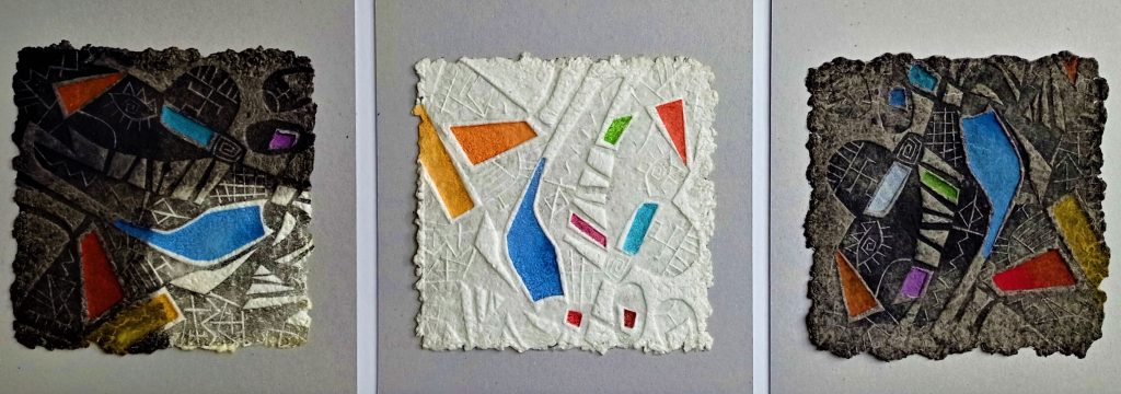 Lietuvą konkurse astovaujančios Menų akademijos lektorės pristato skirtingomis technikomis kurtus darbus: S. Bronickienė spalvingą triptiką “Abstrakčios metamorfozės” (rankų darbo popierius, lino raižinys, 2021 m.), o L. Grabauskienė – trijų dalių kūrinį paslaptingu pavadinimu “Mėnulio pilnaties sapnai” (mišri technika, 2021 m.).