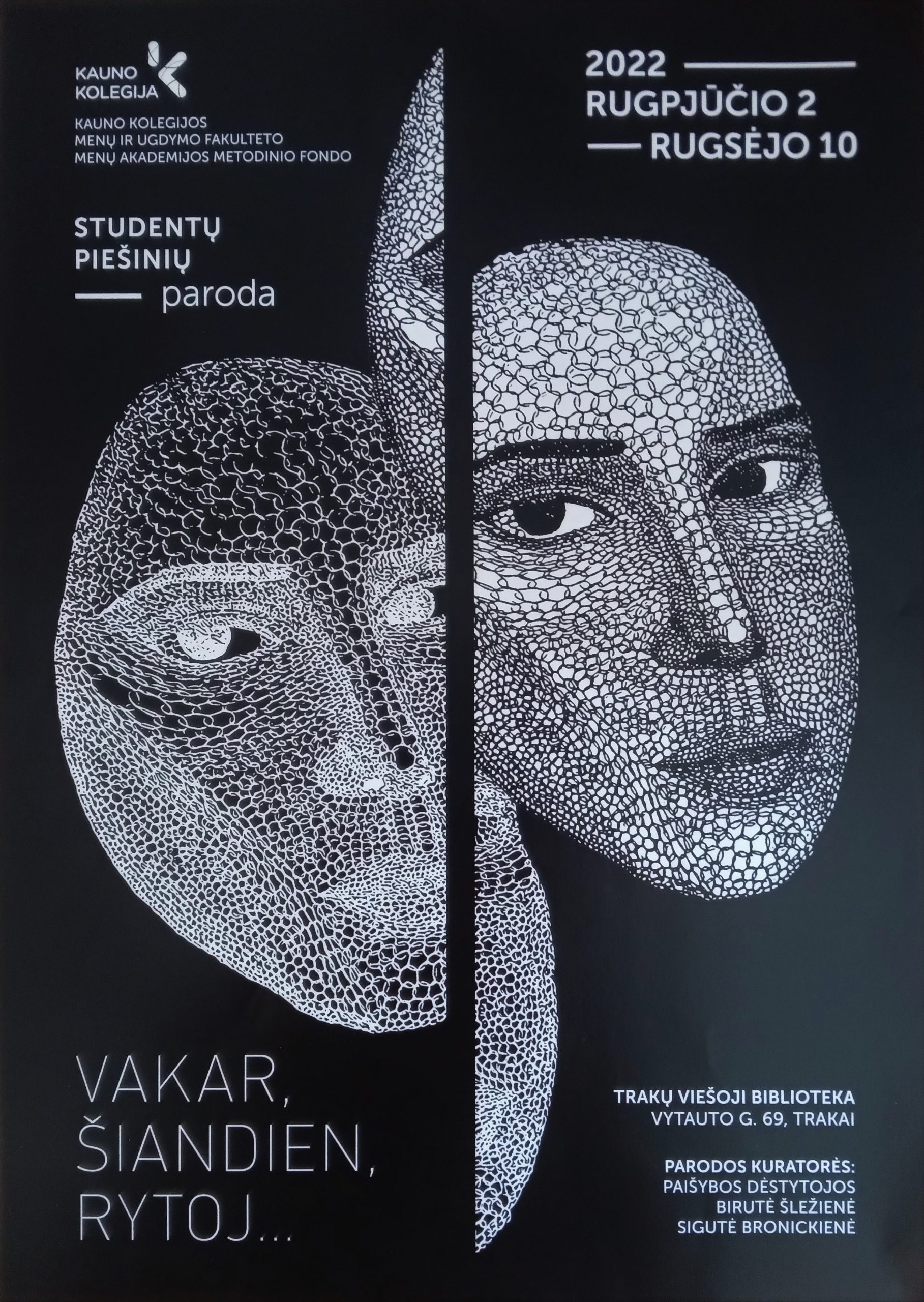 Iki rugsėjo 10 d. Trakų rajono savivaldybės viešojoje bibliotekoje (Vytauto g. 69, Trakai) eksponuojama Kauno kolegijos Menų ir ugdymo fakulteto Menų akademijos studentų piešinių paroda „Vakar, šiandien, rytoj…“, kuruojama Dizaino studijų programos lektorės, grafikės Sigutės Bronickienės ir Stiklo, keramikos, odos, tekstilės meno studijų programos lektorės, keramikės Birutės Šležienės. Ekspozicijoje pristatomi skirtingų vizualiųjų menų, dizaino specialybių ir kursų studentų piešiniai, saugomi Menų akademijos metodiniame fonde.