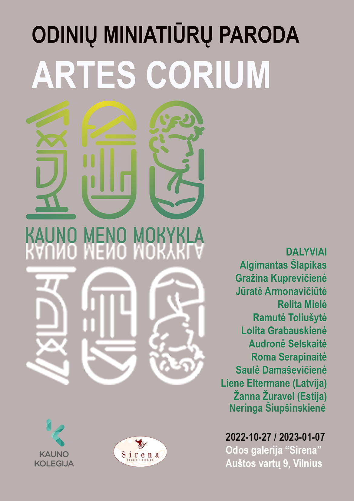 Spalio 27 d. (ketvirtadienį) 17 val. odos gaminių galerijoje „Sirena” (Aušros vartų g. 9, Vilnius) atidaroma Kauno kolegijos Menų ir ugdymo fakulteto Menų akademijos Stiklo, keramikos, odos, tekstilės meno studijų programos lektorės, odos menininkės Lolitos Grabauskienės kuruojama tarptautinė odos miniatiūrų paroda „Artes Corium”, kurioje dalyvauja ir programos dėstytoja Neringa Šiupinskienė. Paroda dedikuojama Kauno meno mokyklos įkūrimo 100-mečio jubiliejui.