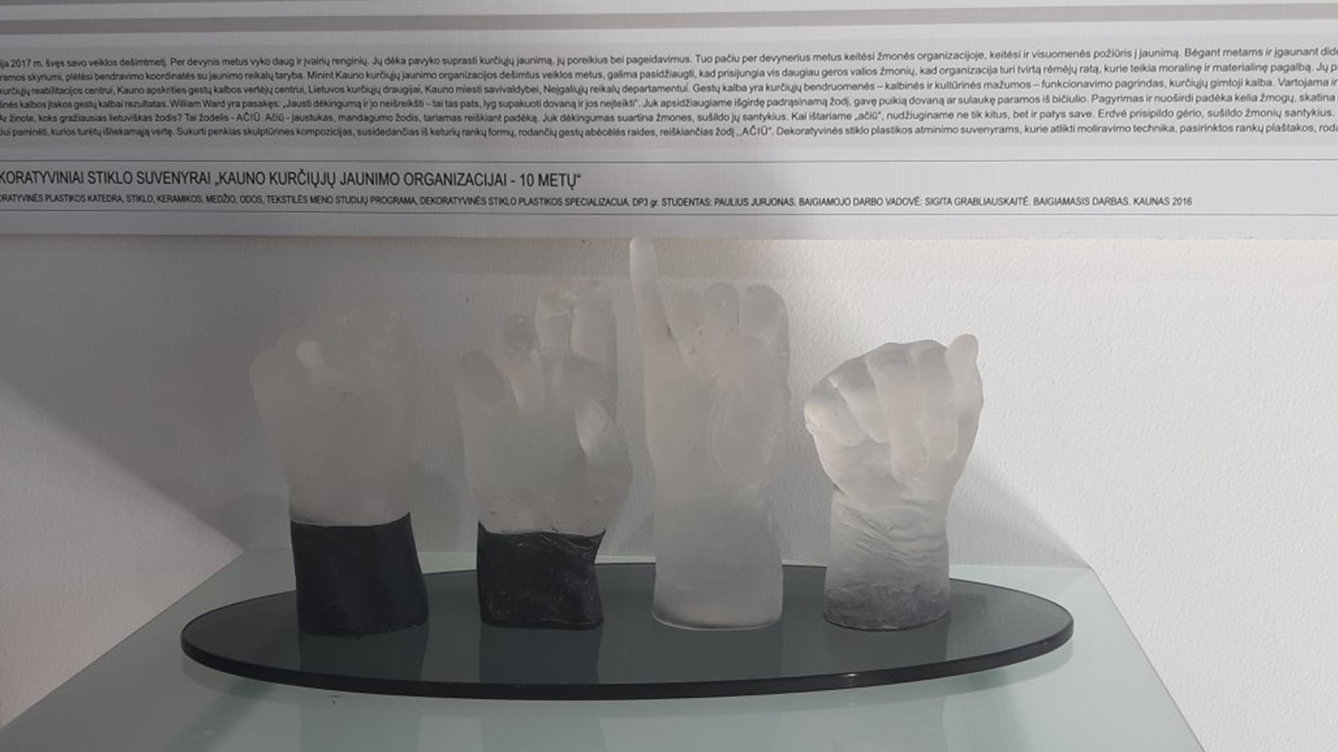 Absolventė Anželika Mikalauskaitė parodoje pristato dekoratyvinę stiklo kompoziciją „Emocionalūs šachmatai” (vad. Sigita Grabliauskaitė). Metafora į šachmatų žaidimą norima atkreipti dėmesį į žmogaus pasimetimą tarp populiariosios kultūros formuojamų stereotipų, skatinamo materialumo, nuomonės formavimo ir t.t. Dekoratyvinė stiklo kompozicija „Emocionalūs šachmatai” tai – unikalios stiklo skulptūros, įgyvendintos stiklo klampinimo formose būdu. Vienetinių kūrinių gamybos technika pasirinkta norint atskleisti figūrų savitumą, akcentuojant skirtingas emocijas, kurias išreiškia kiekviena šachmatų figūra. Absolvento Paulius Jurjono baigiamasis darbas dekoratyviniai stiklo suvenyrai „Kauno Kurčiųjų jaunimo organizacijai – 10 metų“ (vad. Sigita Grabliauskaitė) tai – penkios skulptūrinės kompozicijos, sukurtos iš keturių žmogaus plaštakų atliejų, rodančių gestų abėcėlės raides, iš kurių susideda paprastas, tačiau gražus ir svarbus žodis kiekvienam iš mūsų – „ačiū“. Kūrinyje atsiskleidžia meistriškas P. Jurjono moliravimo technikos įvaldymas, jos galimybės.