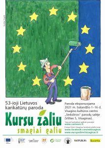 Balandžio 1-oji – juokų diena. Šia proga kviečiame apsilankyti Visagino Europe Direct informacijos centro kartu su Lietuvos dailininkais karikatūristais surengtoje karikatūrų parodoje „Kursu žaliu, smagiai galiu“, kurioje dalyvauja Kauno kolegijos Menų akademijos Dizaino studijų programos dėstytojas, dizaineris ir karikatūristas Alvydas Jonaitis. Šių metų parodos tikslas, pasitelkiant humorą, pažvelgti į žmogaus santykį su gamta, jo daromą neigiamą poveikį aplinkai.