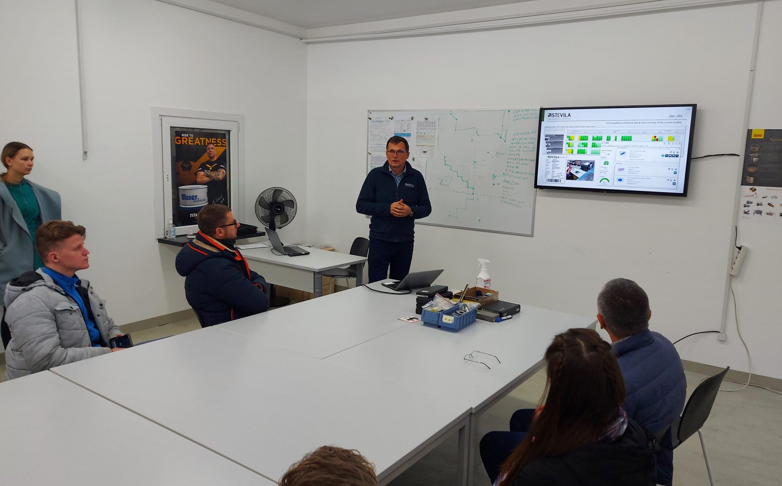 Šią savaitę Kauno kolegijos Pramonės inžinerijos ir robotikos katedros studentai ir dėstytojai vyko į Mokolų kaime, Marijampolės rajone, įsikūrusią bendrą Lietuvos ir Vokietijos metalo apdirbimo įmonę UAB „Stevila“. Išvykoje dalyvavo pramoninio dizaino inžinerijos studijų antro kurso studentai drauge su katedros vedėju Vytautu Čapu ir docentu Gintaru Keturakiu.